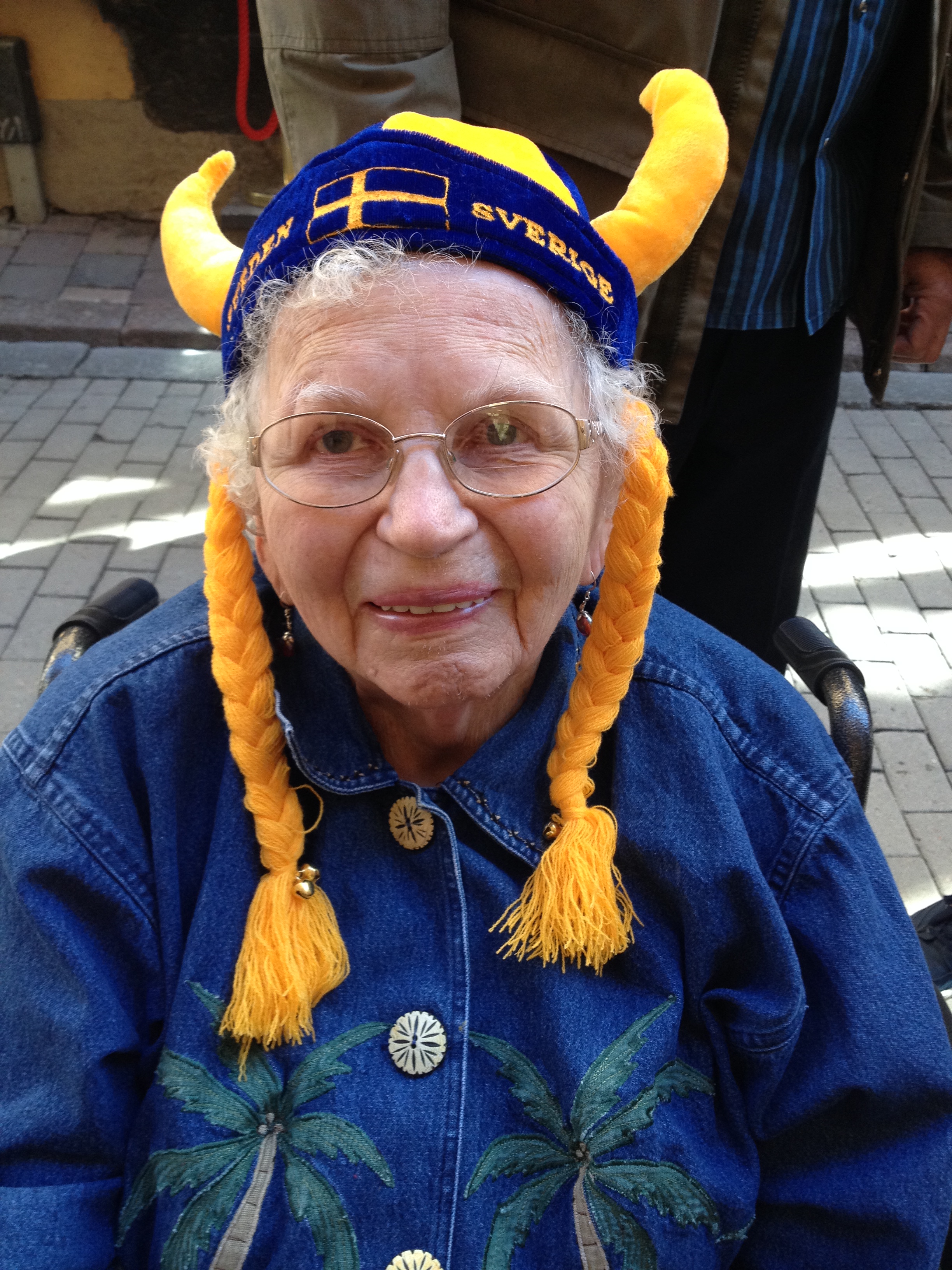 Here we are taking a snack break on the banks of the straight that leads to the Baltic Sea. Mom’s in the shadow – so here’s another photo in her viking cap.